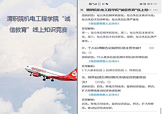 本次竞赛活动以宣传诚信知识,增强诚信意识,培养当代老员工责任意识为目的。利用网络平台采用线上答题的方式开展,试题包括选择题,填空题和简答题,题目从题库中随机抽取。试题内容聚焦诚信教育和责任心培养。题目新颖、实用性强,且充分发挥互联网的优势,实现了多地点、同时间、全覆盖、高参与的特性,进一步增强了同学们的诚信观念和责任意识。
