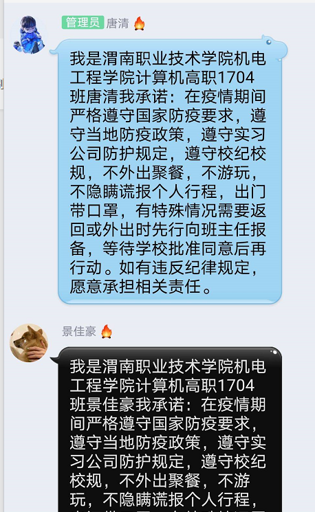 针对员工管理在政策落实方面提出三点要求:一是疫情管理工作中,监控班级员工打卡,确保每日100%打卡及数据的真实性。所有的顶岗实习员工坚守不流动的原则,如有特殊情况,及时上报公司备案,获得相关指令后方可在岗位上异动。对于中高风险地区员工逐一进行思想教育,建立员工档案,引导员工严格遵守公司的疫情管理规定和企业的管控要求,不流动不走动,确保自己的生命安全。二是4月1日前完成17级线上主题班会召开。班会中要强调员工管理及纪律要求。开展思想教育工作,提升员工的思想认识,让员工真正领会当下疫情的严重性,理解国家及公司政策的背后价值与意义,要求员工严格遵守当下的疫情政策要求,跟踪每个员工完成自律承诺书,确保将公司的政策落到实处。三是本周内各班必须要开展线上家长会。鉴于在校生在家网课学习时间较长,思想容易出现松懈怠慢。除了在每周的班会上做好员工的心理疏导工作外,还要组织家长开展家长会,希望获得家长对员工学习的认可及支持,家校配合,共同做好疫情管理及线上教学。(撰稿:伟德体育 贺峰鸽 审核:盛君国)