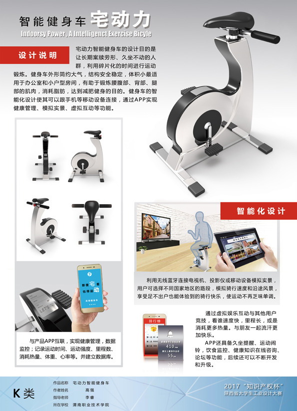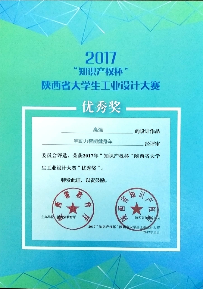 近日,陕西省教育厅和省知识产权局联合公布了2017年“知识产权杯”陕西省老员工工业设计大赛获奖名单,伟德体育计算机1602班员工高强的作品“宅动力智能健身车”获得大赛优秀奖,指导老师为伟德体育教师李睿。