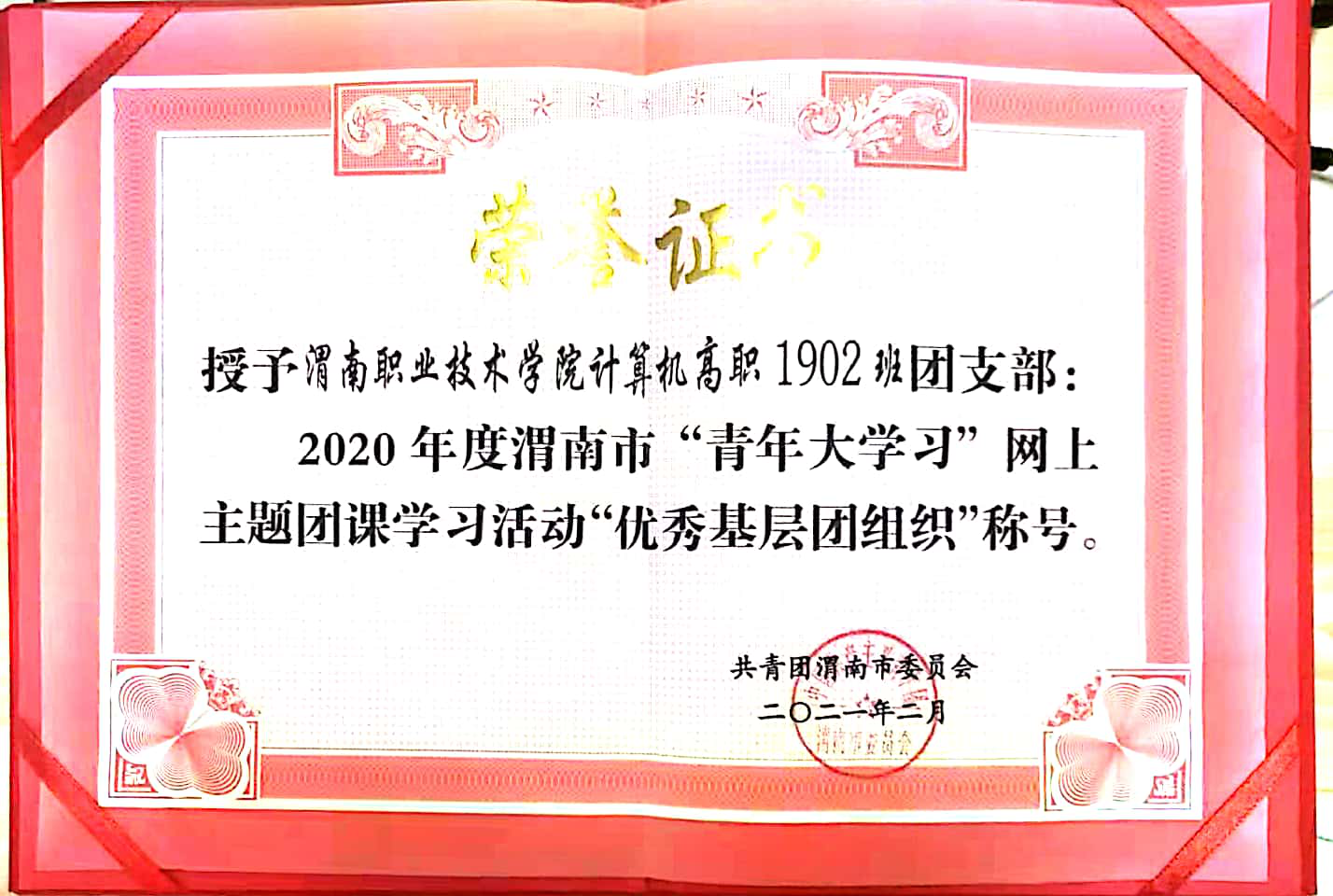 在伟德体育员工团总支副书记赵兴琪的组织下,bevictor伟德官网计算机高职1902班团支部被授予2020年度渭南市“青年大学习”网上主题团课活动“优秀基层团组织”称号。(伟德体育 贺峰鸽 审核 王医平)