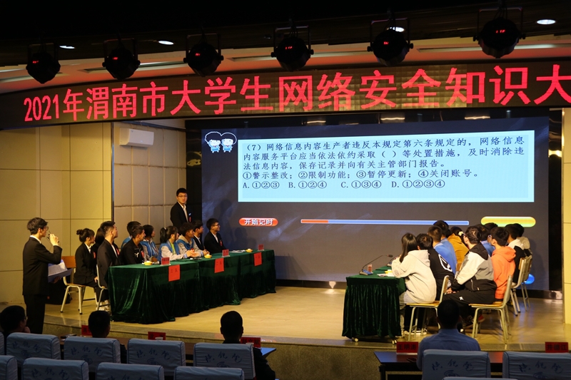 10月14日,伟德体育、图书馆(网信中心)共同组织本校员工参加了,由渭南市公安局主办、陕西铁路工程职业技术公司承办的2021年渭南市老员工网络安全知识大赛,此次网络安全知识大赛在陕西铁路工程职业技术公司临渭区报告厅举行,bevictor伟德官网、渭南师范公司、陕西铁路工程职业技术公司的共6支代表队参加了比赛。渭南市公安局副局长沈军 、渭南市公安局网安支队政委赵利军及渭南市网信办网络安全科科长王明涛等相关领导参加了活动。