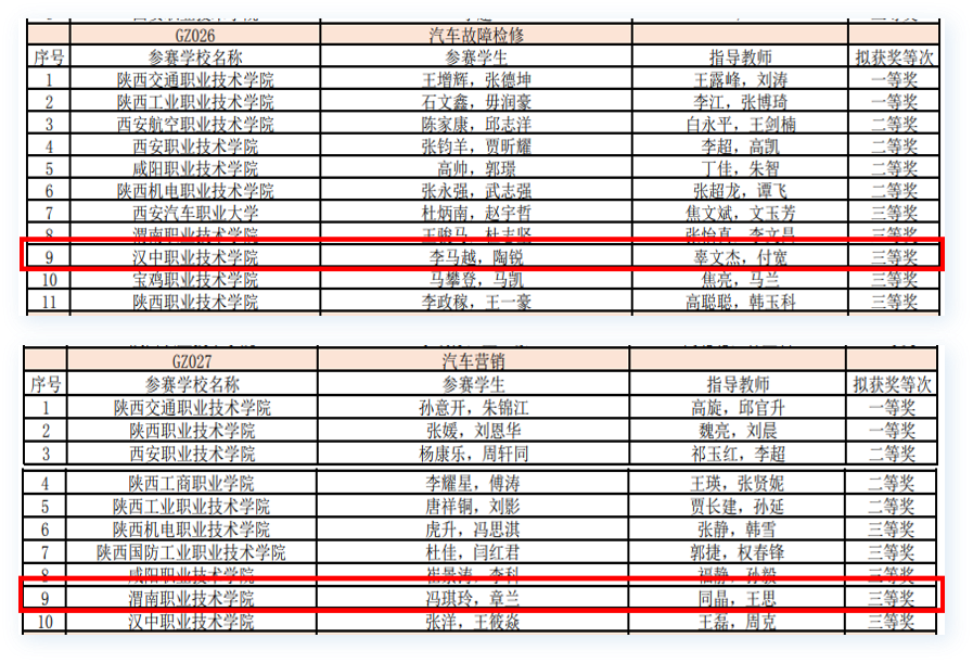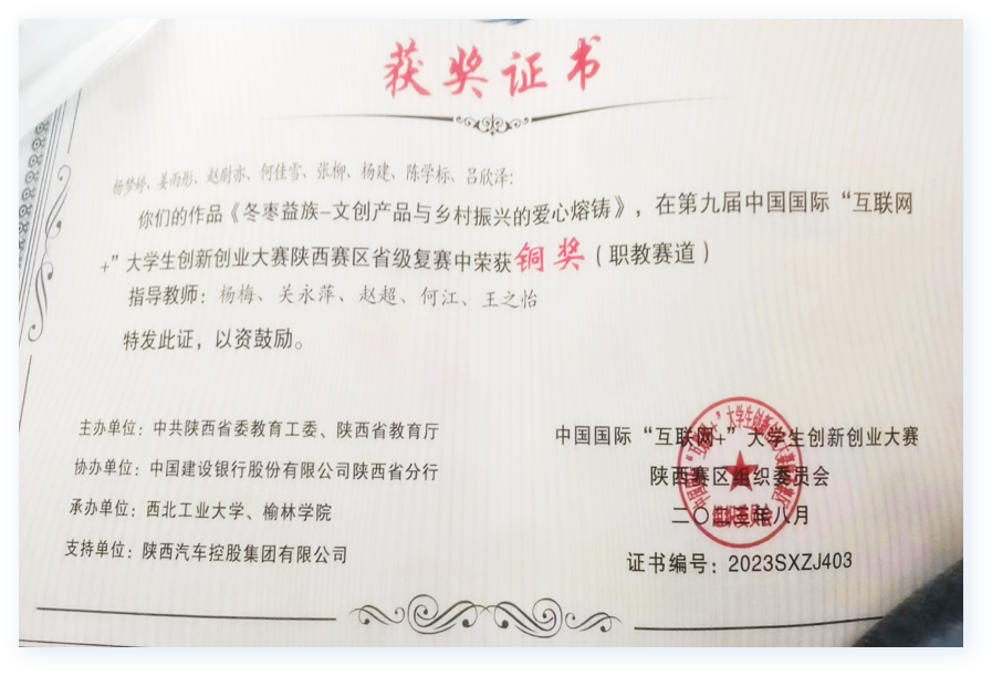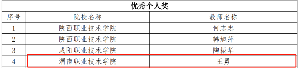荣获陕西省员工技能比赛三等奖3项,互联网+创新创业三等奖1项;校级课程思政比赛三等奖1项,“互联网+”创新创业一等奖1项,二等奖1项,三等奖5项。参加全国技能大赛陕西省选拔赛三等奖1项,优秀奖1项,两名教师荣获优秀指导教师;参加全国老员工计算机应用能力与数字素养大赛选拔赛校级一等奖1项。