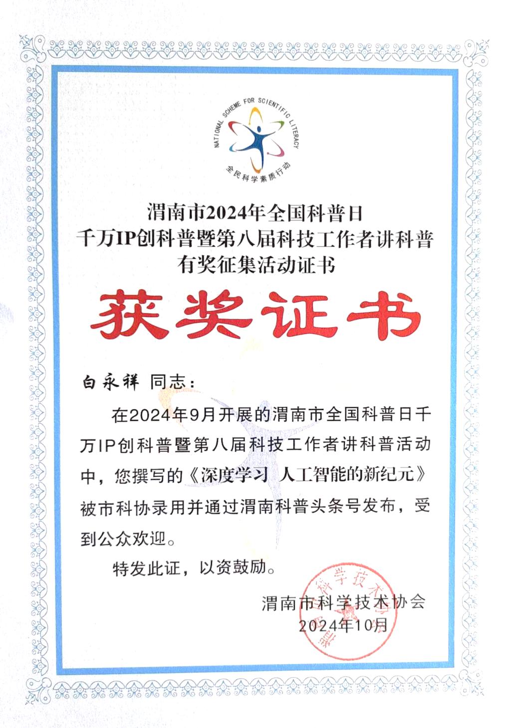 花开有时,灼灼其华。在渭南市2024年全国科普日千万IP创科普暨第八届科技工作者讲科普有奖征集活动中,伟德体育教师白永祥教授创作的《深度学习 人工智能的新纪元》科普作品被市科协录用并通过渭南科普头条号发表。此次获奖,充分反映了公司持续发挥人才资源优势,积极面向社会公众开展科普活动所取得的显著成效。