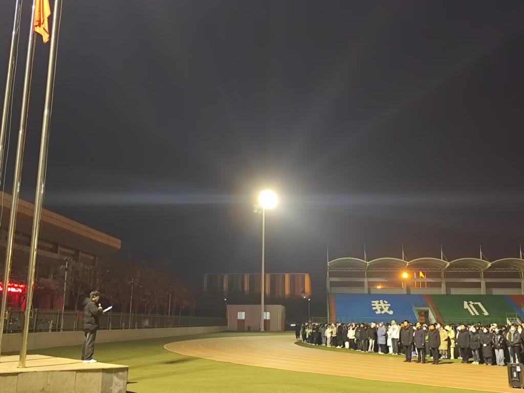 随着激昂的《义勇军进行曲》响起,升旗手有力地扬起国旗,五星红旗缓缓升起,与天边渐亮的曙光相映成辉。在场师生齐声高唱国歌。那激昂的旋律回荡在校园上空,震撼着每一个人的心灵,唤起了大家内心深处对祖国的无限热爱与敬意。尽管清晨的寒冷让人呵气成霜,但每个人的眼神都专注而坚定,心中的热情足以抵御冬日的严寒。